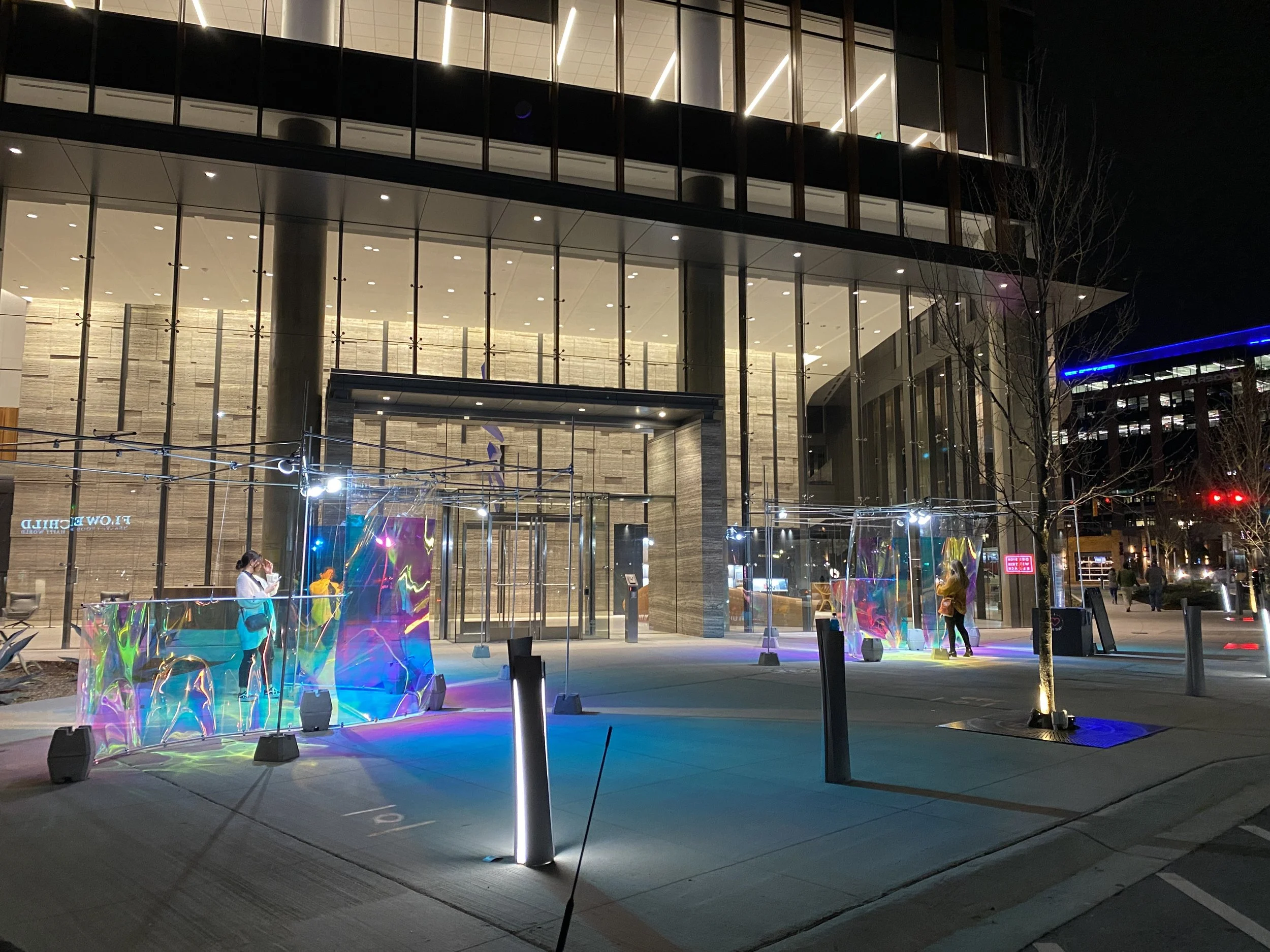 Covid Confessionals is a rapid response public installation temporarily constructed in response to Covid-19 along the Rail Trail in Charlotte South End. Responding to a call for installations which appropriate light as a primary medium during a pandemic, the design team developed a collection of “confessional booths” made of iridescent curved walls, defined by a 6-foot radius, which produce a vibrant field of color through play of reflection and light. The confessionals act as room-sized face shields that encourage physical distancing, while also casting colorful raking shadows of color and caustic light effects in response to sunlight and artificial night lit conditions. The ground plane surrounding the urban shields demarcated distancing measures with a corresponding chalk painted grid and a set of vibration activated light pads generously spaced to encourage physically distanced interaction and play. The project tries to demonstrate how design can provide a safe space to support the health and well-being of the community in a time of social isolation.